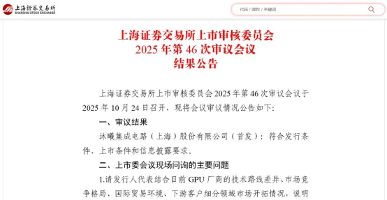 10月24日,诚通基金所管理的国调基金投资企业沐曦集成电路(上海)股份有限公司(简称“沐曦股份”)IPO申请获上交所科创板上市委审议通过,标志其作为聚焦高性能通用GPU领域的硬科技企业向资本市场迈出关键一步,成为科创板“1+6”改革举措落地后的典型案例,也是国调基金投资助力解决核心科技领域“卡脖子”问题的代表性项目。